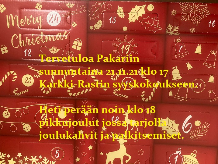 Tervetuloa Pakariin su 21.11.21 klo 17 syyskokoukseen. Heti perään noin klo 18 pikkujoulut jossa tarjolla joulukahvit ja palkitsemiset.