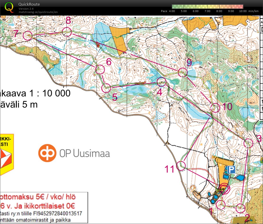 Kaiken kaikkiaan aikaa harjoitukseen meni hieman reilut 37 minuuttia, josta siis tehollinen juoksuaika n. 31 minuuttia. Virheitäkin tuli, pahimpana 6. rastin kurvailu, lisäksi suuntavirheitä.